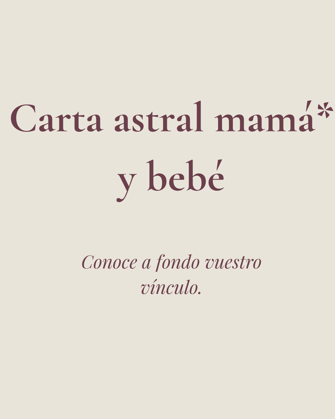Carta astral de mamá* y bebé, por separado y escritas en profundidad y una sesión individual de una hora y media online para profundizar por separado y en conjunto. Las dos cartas astrales interactúan íntimamente, descubre que energías os mueven, donde te va a remover tu criatura, que le puede impulsar, que vas a aprender de ella, cómo ayudar desde tu propia fuerza interna, cómo ambas existencias pueden conocerse mutuamente y ayudarse desde el amor.